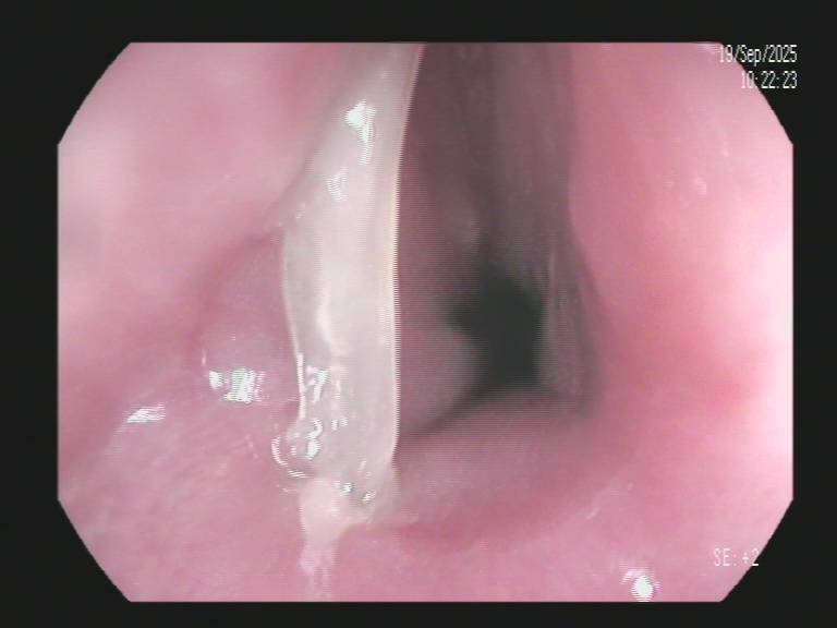 经胸部CT检查,明确诊断为食管内异物。情况较为棘手,因为患者自行处理的行为已导致长约3厘米的鱼刺横向卡于食管管腔,两端尖锐处深深扎入食管壁,扎入深度超过1厘米,造成局部黏膜严重损伤,极大地增加了食管穿孔、感染和出血的风险,也使得取出操作变得复杂。