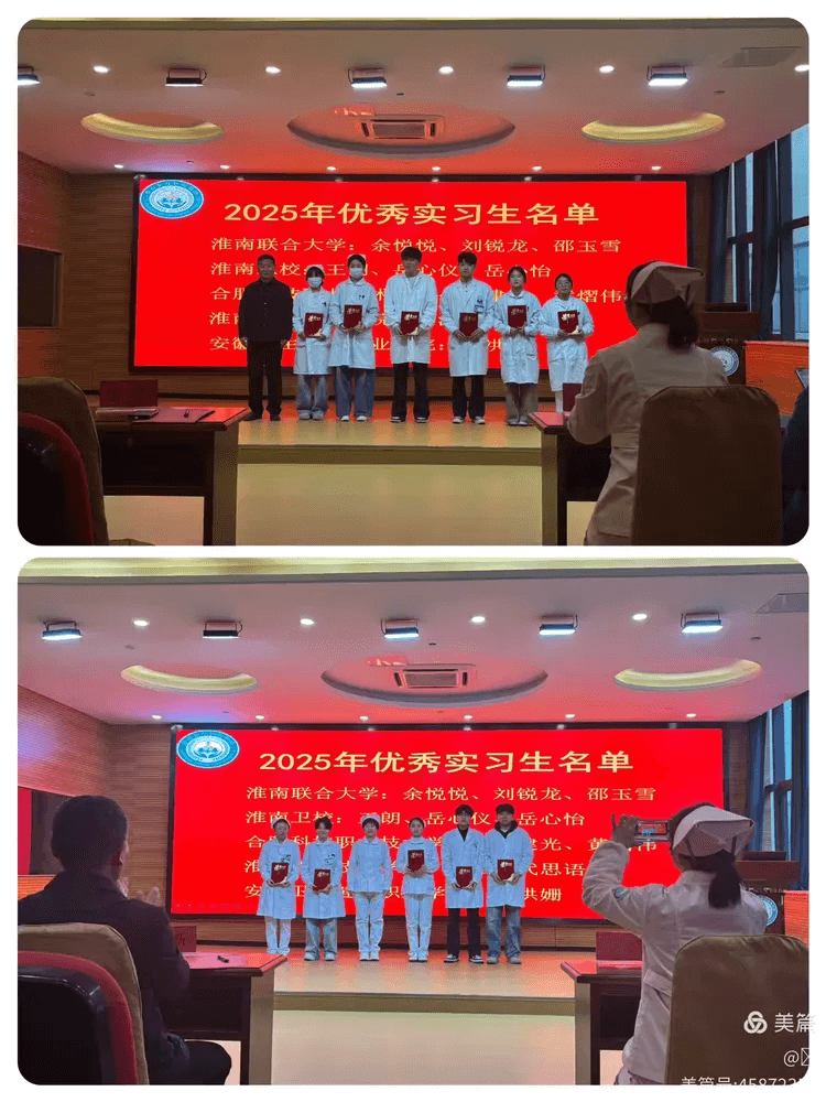 典礼隆重表彰了在实习期间表现优异的护理学子。经过科室推荐、护理部评审,共评选出11名优秀护理实习生。获奖实习生依次上台,由安新书记和护理部丁主任颁发荣誉证书。